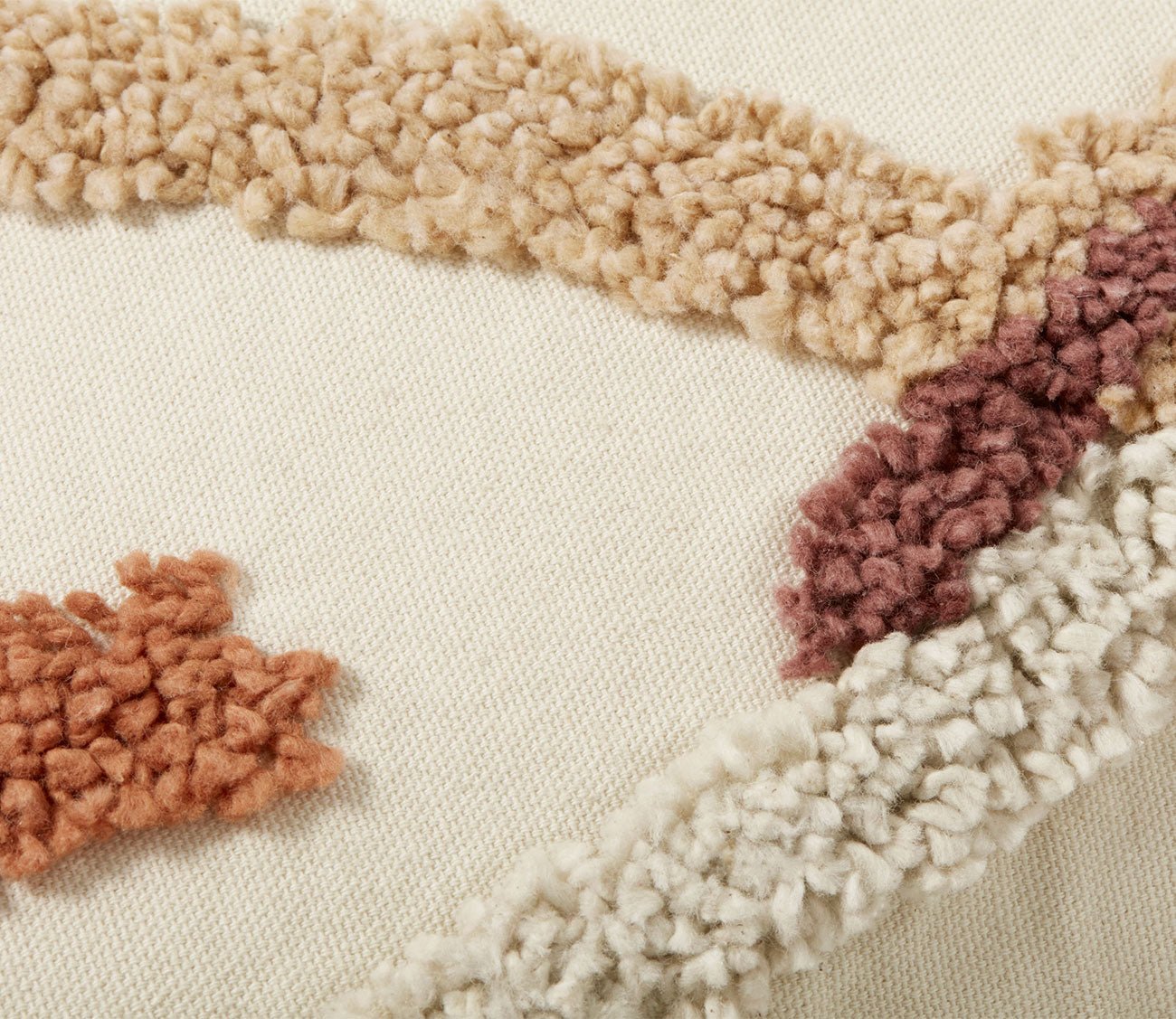 - Tufted embroidery at the cover with thick, textured threads in an abstract pattern.