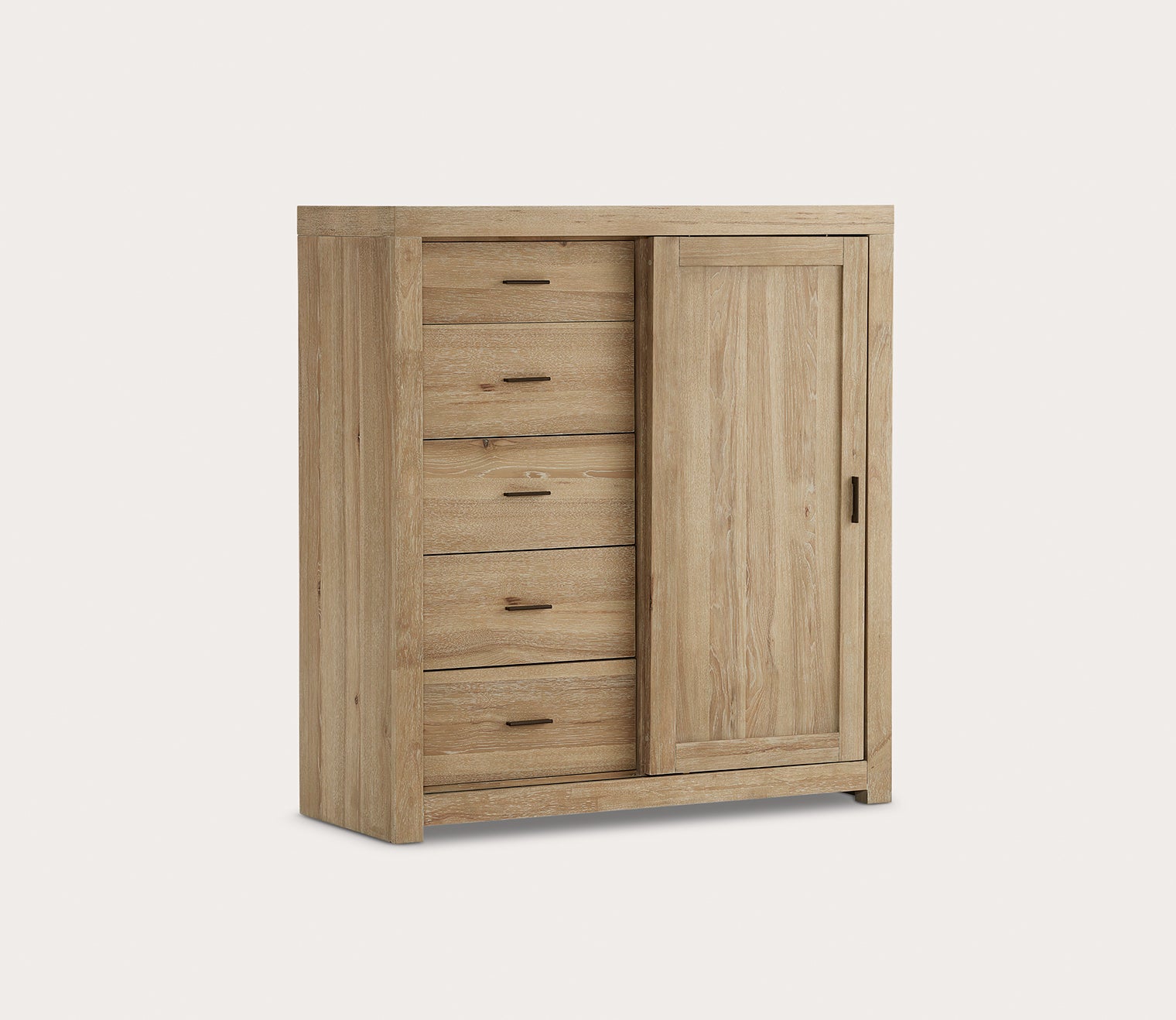Discover a modern storage solution to enhance your bedroom—the Aspen Home Modern Loft Sliding Door Chest effortlessly merges style and functionality. Crafted from select hardwoods with hickory veneers, this storage chest with a sliding door features a light brown khaki finish, highlighting its distinctive grain variations and clean lines. A sliding door reveals adjustable and removable shelves, offering customizable storage to suit your needs, while five vertically stacked drawers maximize organization.