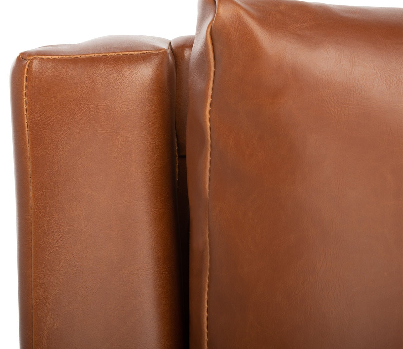 An equally chic and cozy addition to your seating area, Safavieh’s Astrid Mid-Century Armchair makes a stylish statement. With welcoming comfort and plush foam-filled cushions, this upholstered accent chair with armrests features vegan cognac brown leather or stone grey, olive green, or navy blue velvet fabric enveloping the retro silhouette for a luxurious look and feel. A contemporary and fashion-forward take on a timeless style— the splayed solid oak wood legs durably support the lower profile frame.