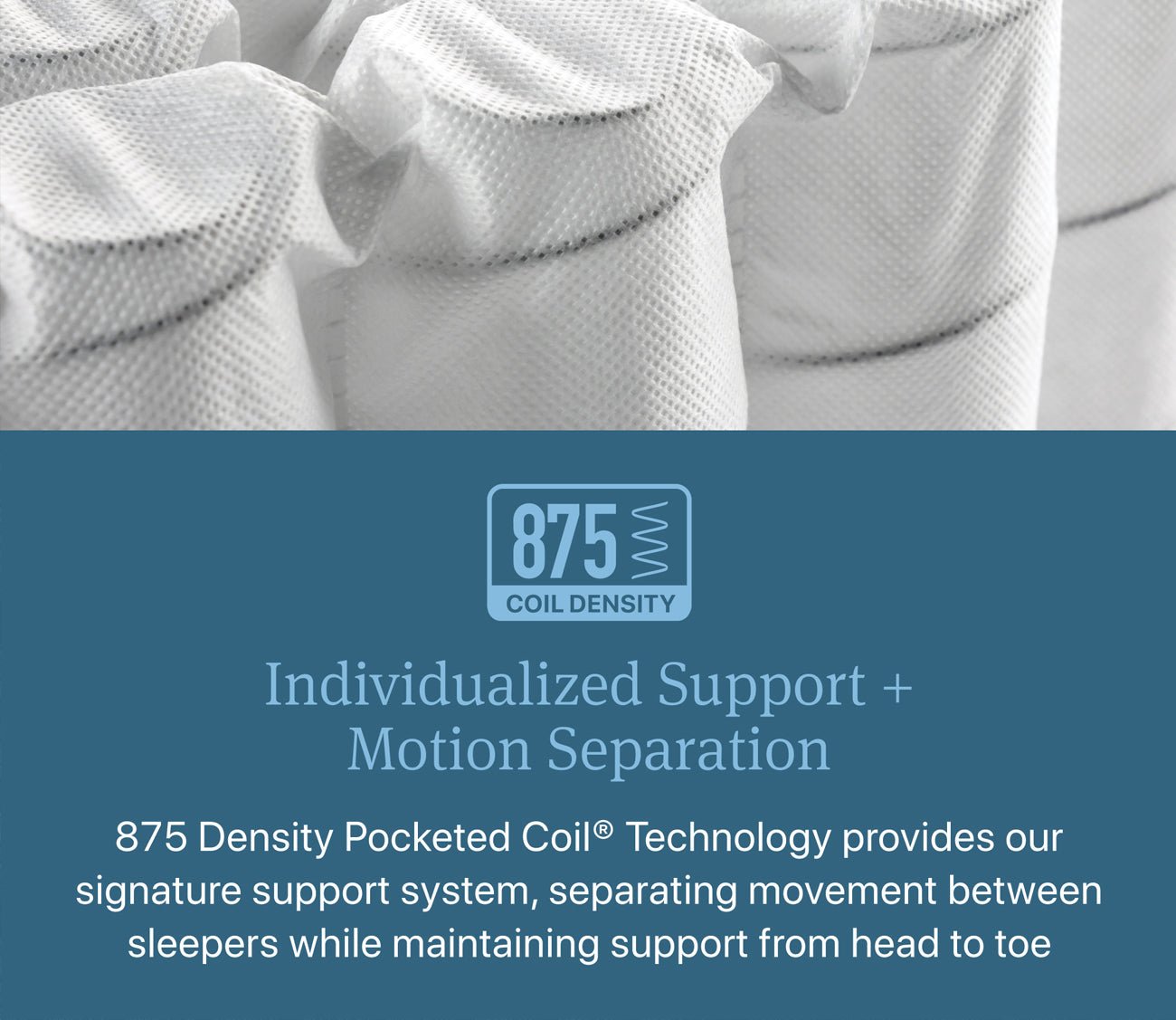 - 875 Density Pocketed Coil® Technology: Personalized support in any sleeping position and motion isolation properties.