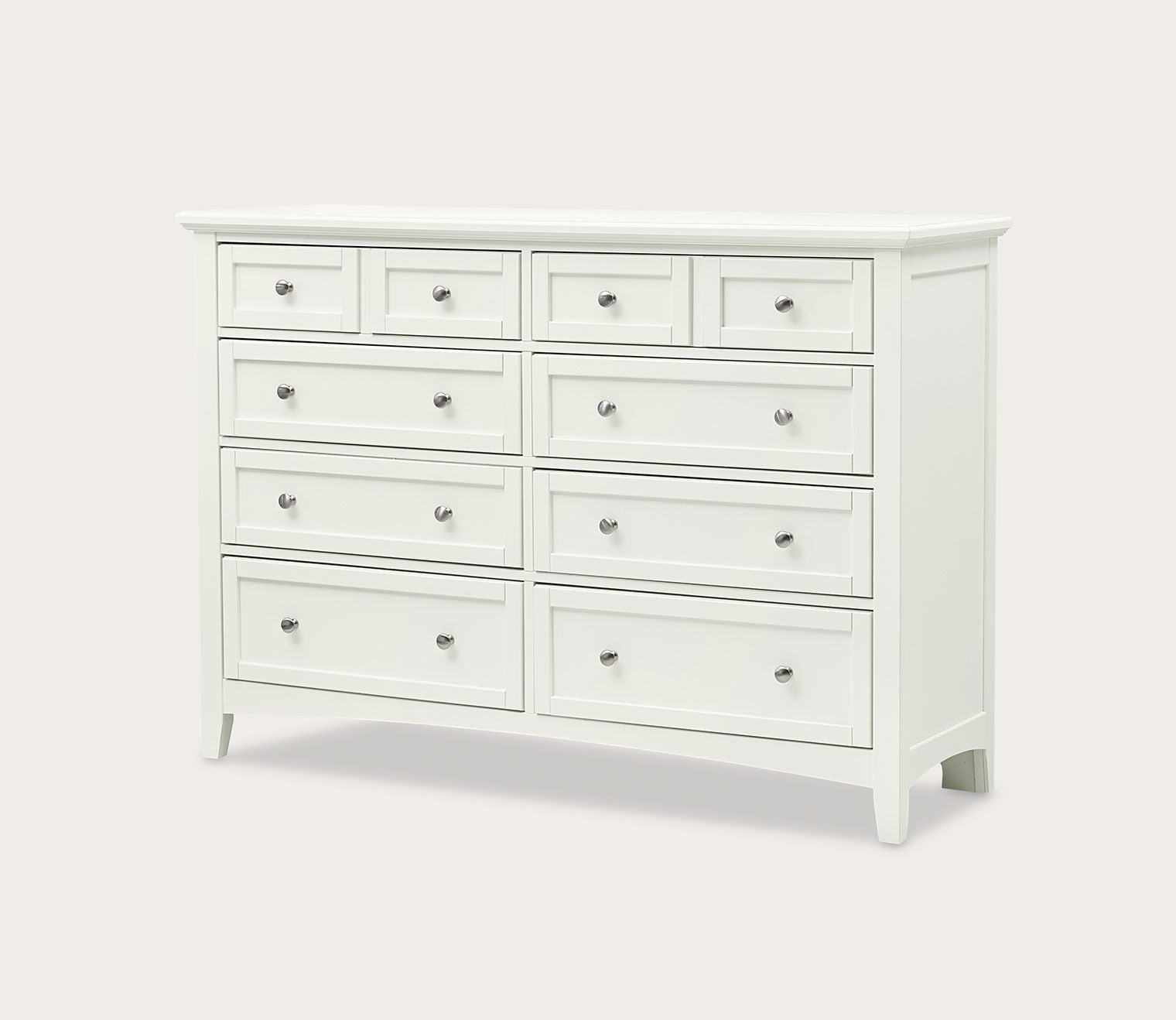 Keep clutter at bay by stowing away clothing and more within the timeless design of Vaughan Bassett’s Bonanza 8-Drawer Triple Dresser. Available in a grey, white, merlot, or cherry finish, this 60-inch-wide wood dresser features a high-quality case made in the USA from cherry veneers and poplar solids with mortise and tension construction. The included anti-tip device adds extra stability, while the multi-drawer design helps to improve organization.