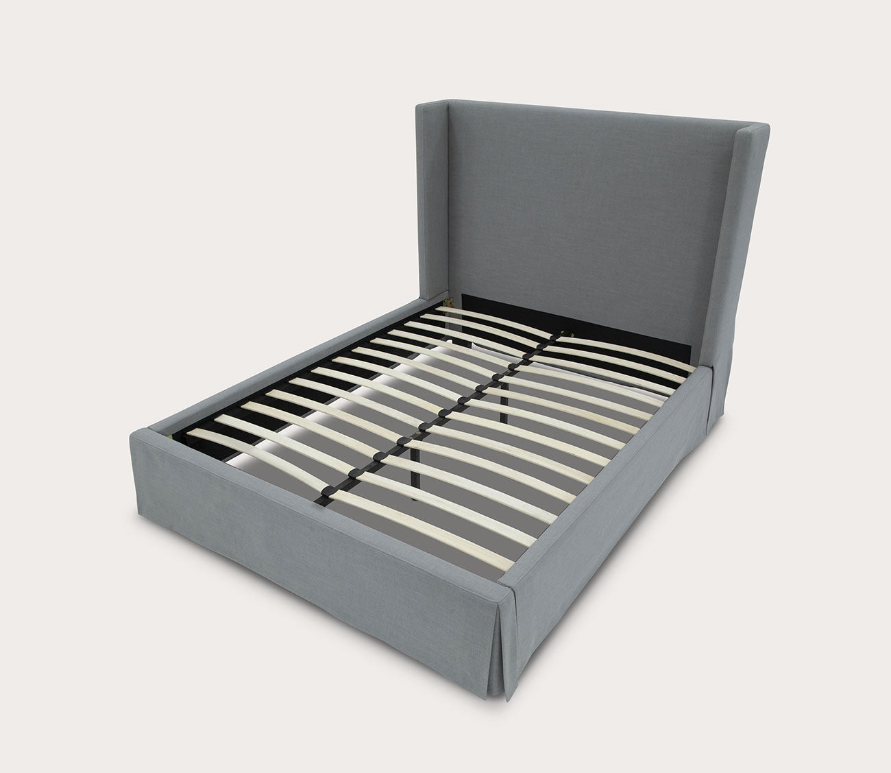Soft and cozy yet sleek and modern, Modus Furniture’s Cresta Upholstered Skirted Panel Bed brings high-quality design and relaxed luxury to your owner’s suite or guest bedroom. With a statement-making wingback headboard with sheltering sides, this platform bed features a clean-lined silhouette with solid wood framing, durable foam layers, and fog-grey linen-blend fabric upholstery. With a slipcover look and inverted pleat skirted base— European-style bentwood slats provide direct support to your mattress; no box spring required.