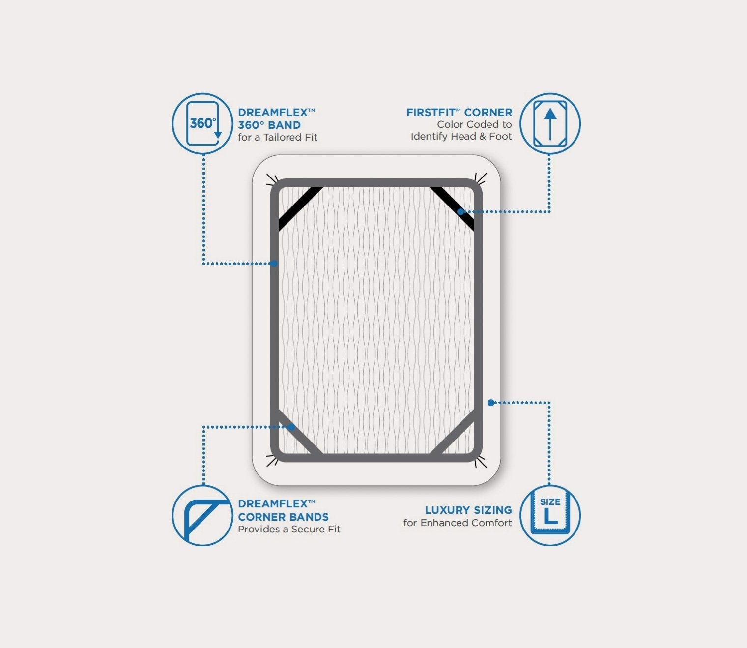 - DreamFlex™ Bands: Fitted sheet is guaranteed to fit and stay on with 4x wider and 20x stronger elastic. Corner bands and 360-degree elastic firmly grip for a tailored fit, even on adjustable beds.