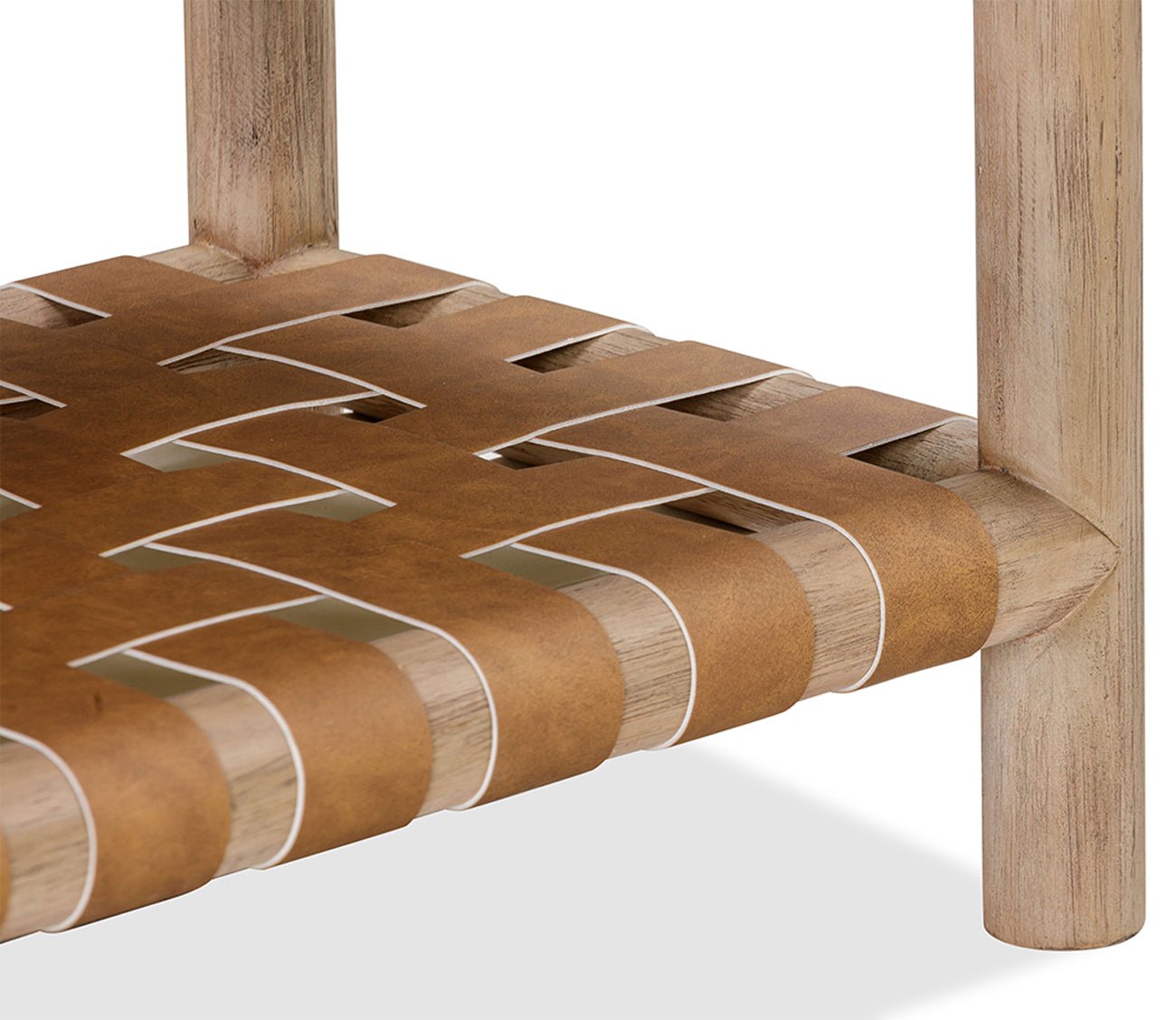 Style your bedroom with the organic charm and contemporary design of Modus Furniture’s Dorsey 1-Drawer Nightstand, featuring USB charging ports. With thick round framing for a smooth silhouette and vertical wood grain, this 26-inch-wide bedside table crafted from solid acacia wood and veneer showcases a soft, light brown tone and wire-brushed finish for a well-weathered, patina look. Built with a single storage drawer and woven brown faux leather bottom shelf— integrated electrical outlets and USB ports maximize convenience tailored to the modern-day lifestyle.