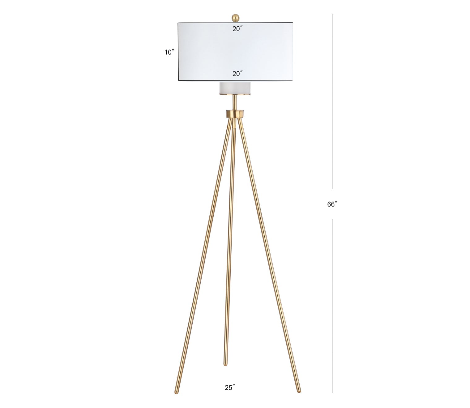 Illuminate and decorate your space with the contemporary allure of Safavieh’s Enrica Tripod Gold Floor Lamp, featuring a graceful, slender silhouette. Including an off-white cotton shade with crisp, clean lines, this 66-inch decorative floor lamp stands tall on a metal tripod body with a gleaming brass gold finish. Inviting shimmering elegance to minimalist rooms— style this lamp beside a reading chair, desk, or a dimly-lit corner.
