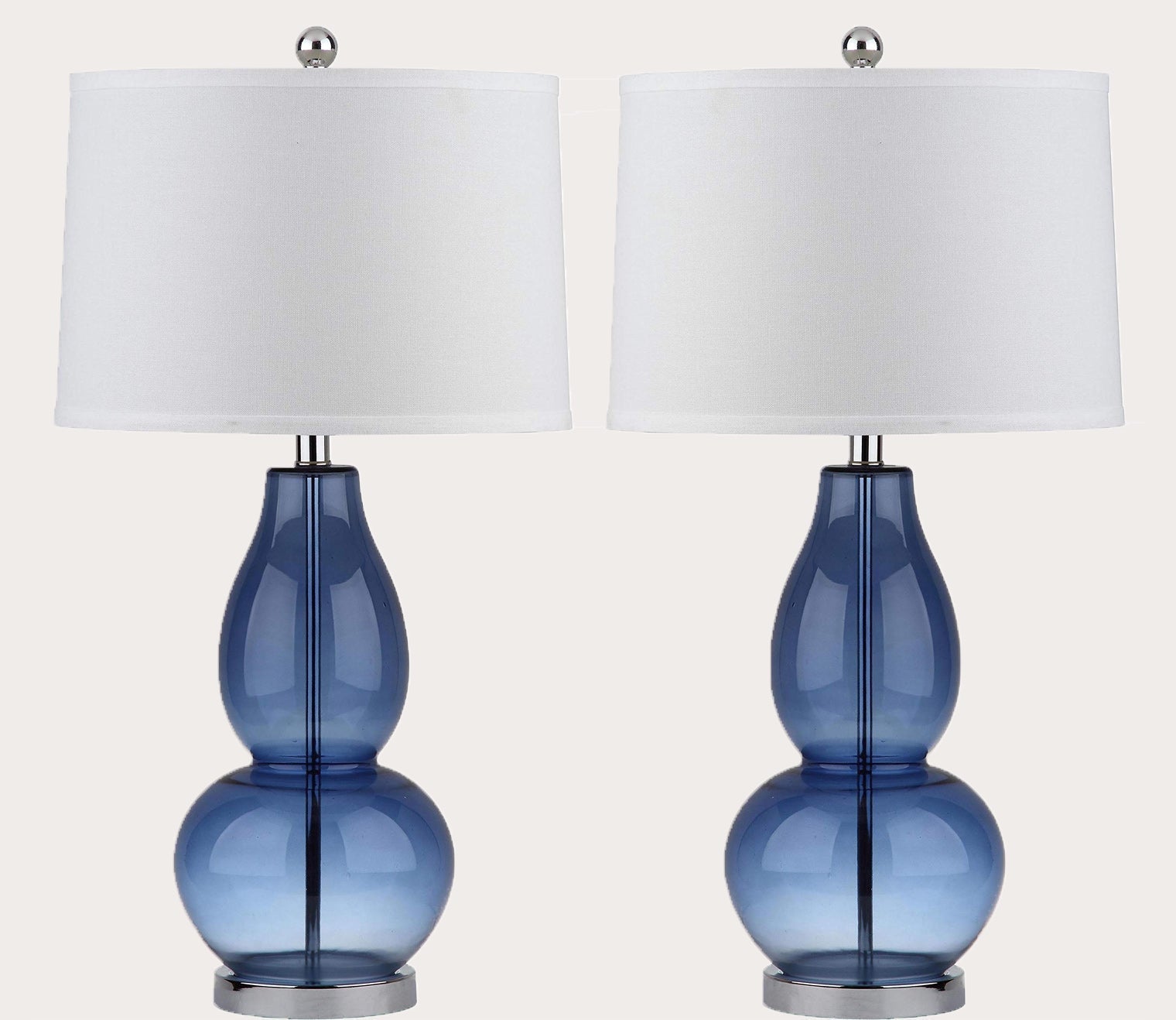 Indulge in timeless elegance with Safavieh’s set of two Mercurio Blue Gourd Table Lamps that blend classic design with contemporary flair. A perfect pair when styled on two end tables or nightstands, these 28.5-inch table lamps feature curvy gourd-shaped bodies crafted from clear blue glass with chrome-finished metal fittings. Topped with elegant white cotton drum shades, these decorative lamps exude sophistication.