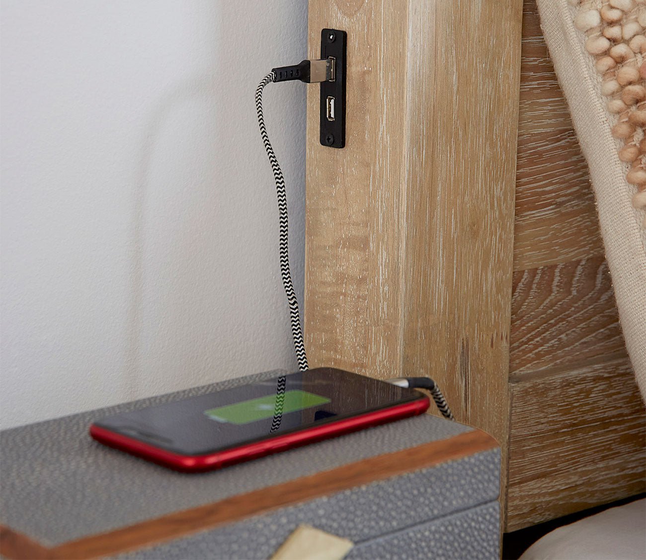 - 2-drawer nightstand with felt-lined top drawer, canted AC-angled electrical outlets, and dovetail joinery.