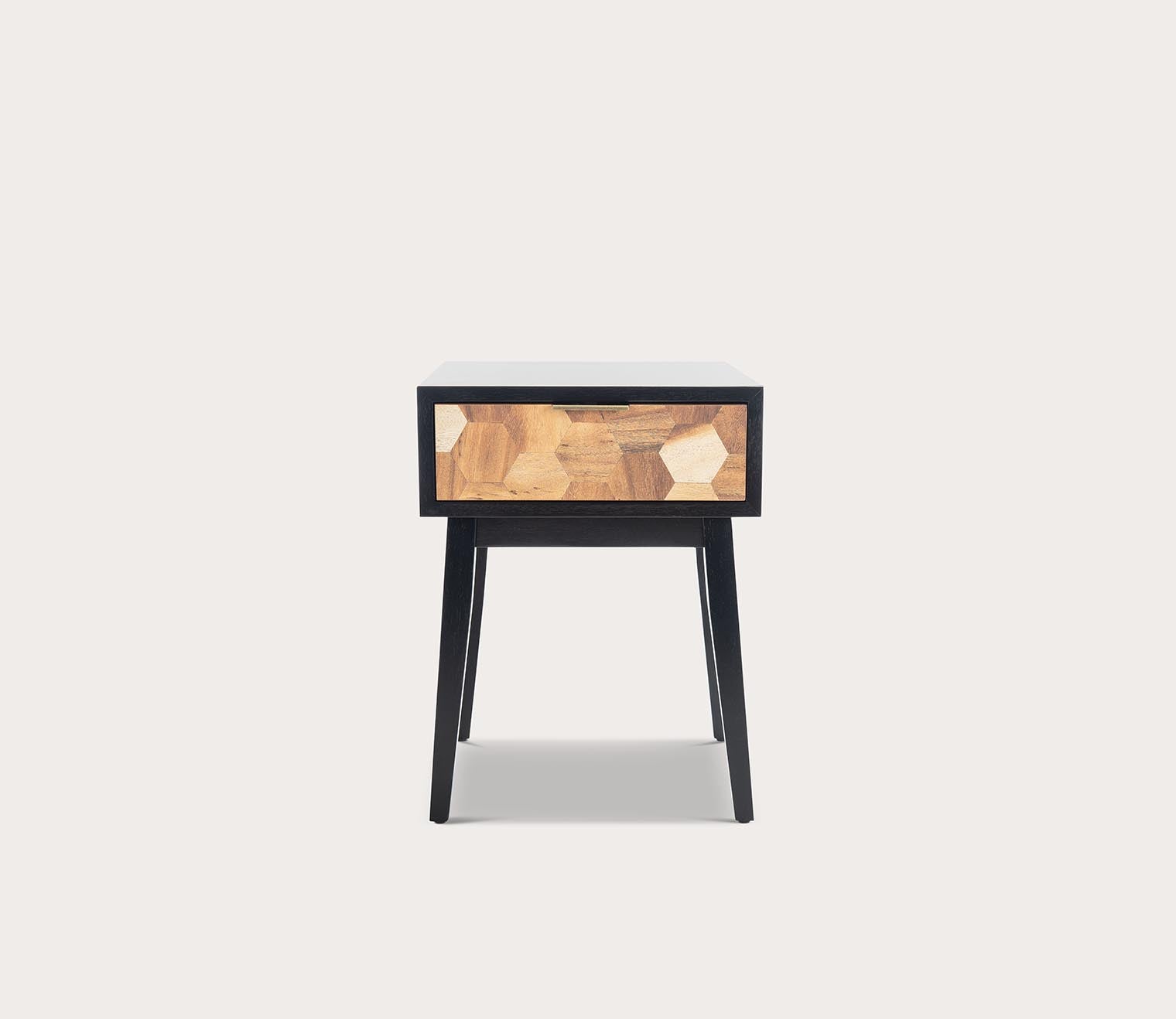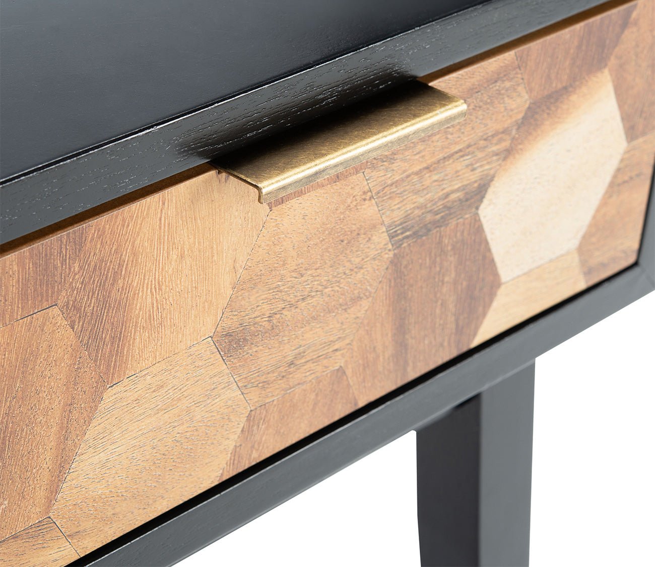 Mid-century modern design reimagined— Safavieh’s Nilo 1-Drawer Accent Table offers conspicuous storage and an eye-catching two-tone style. With a retro silhouette including clean lines and splayed legs, this 18-inch-wide side table features a rectangular shape and a white or black finished frame. The single wood drawer with a brass handle flaunts a variegated hexagon pattern, highlighting the natural grain variations throughout each facet.