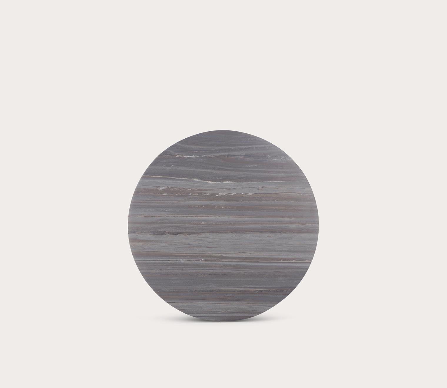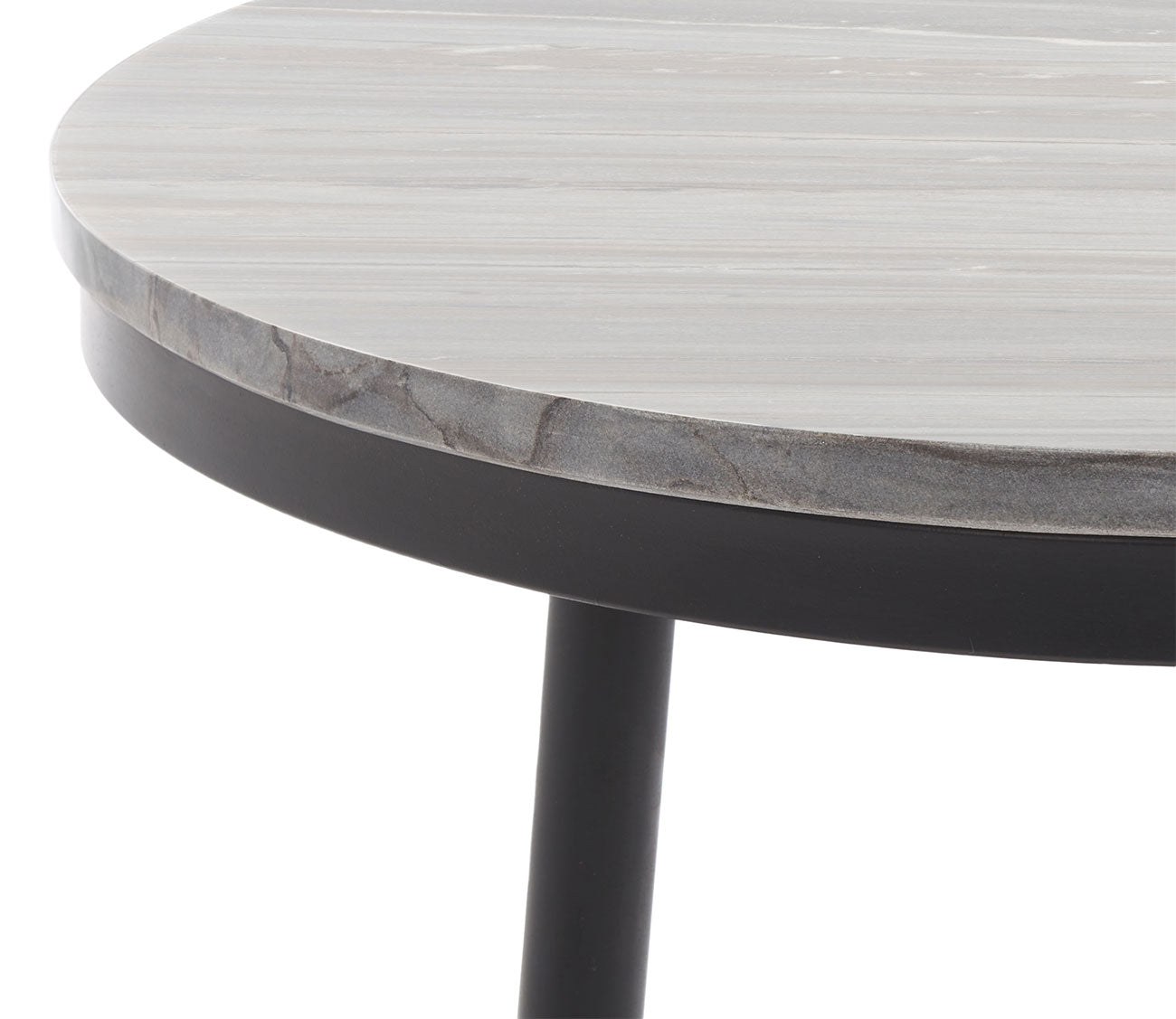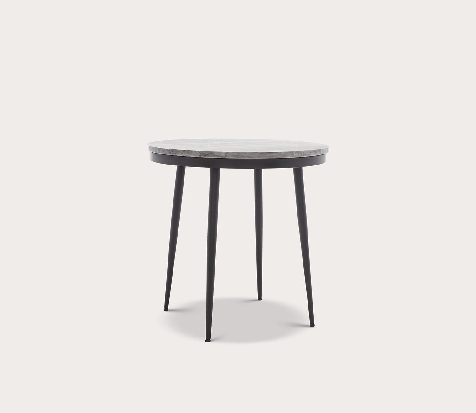 - Black legs with a round, grey marble top.