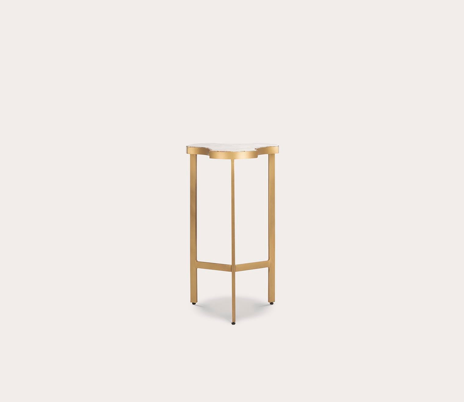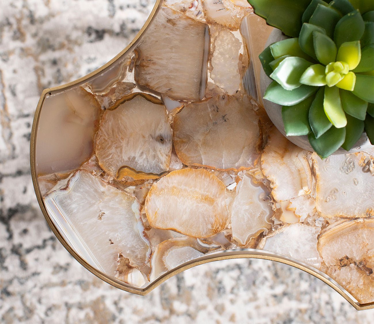 Give your living area a creative touch by decorating with the high-end allure of Safavieh’s Suki Tripod Accent Table, featuring a space-saving 13-inch width and 23-inch height. Built on a sleek gold-finished metal base with a tripod design, this decorative side table makes a glamorous addition to contemporary rooms. The sliced white agate stone tabletop completes the look with organic luxury and a unique cut-in shape.