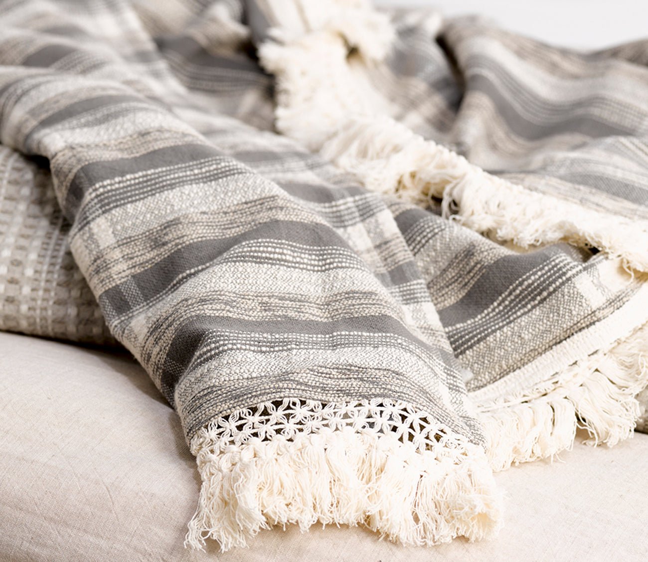 - Cotton fringe detail adorns the ends.
