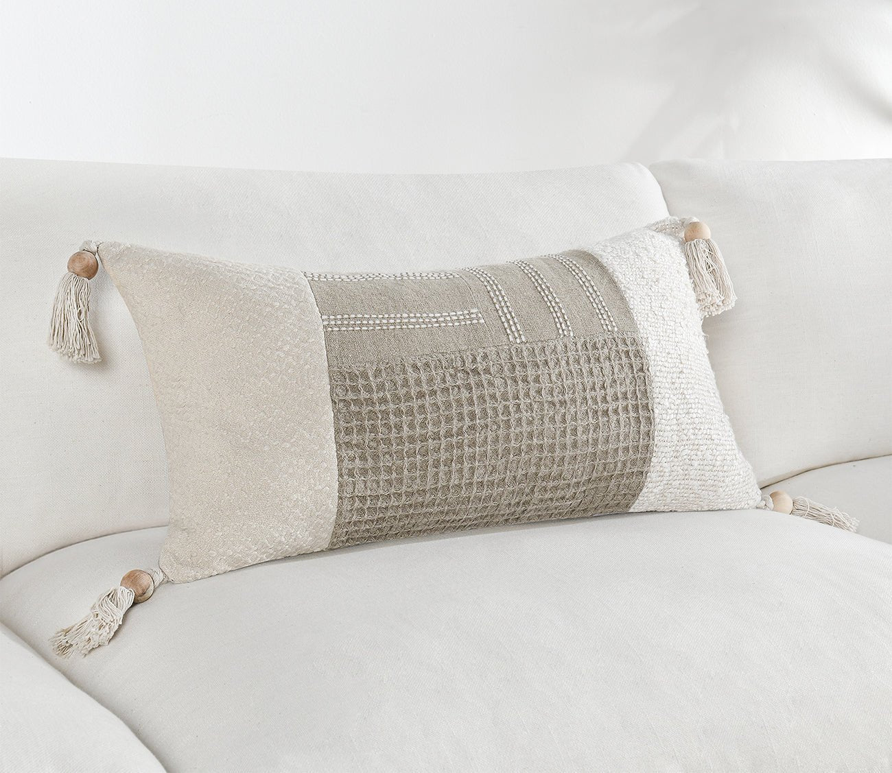Infuse textural dimension and cozy style into your space with Villa Home’s Yasa Natural Ivory Throw Pillow, including a plush feather and down insert. Available in a 14 x 26-inch rectangular lumbar size, this decorative accent pillow features a mixed and matched pieced patchwork design with cotton, linen, and viscose fabric adorned with hand-applied embroidered elements. Wood-beaded tassels add movement and bohemian appeal to each corner, while the natural beige and ivory palette complements the best of coastal chic, modern organic, and rustic interiors.