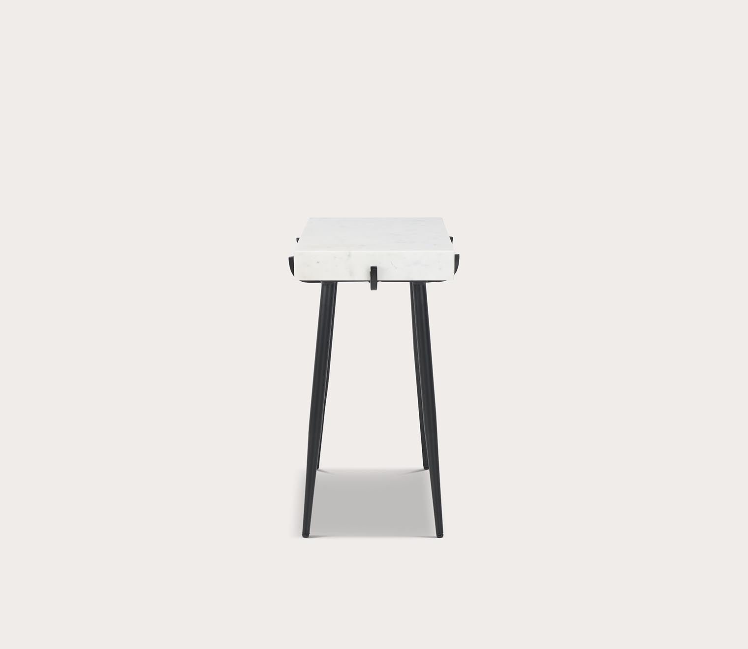 Simplistic beauty and clean elegance combine for the perfect home accent with Safavieh’s Yuki Stone Top Side Table, featuring a sleek rectangular-shaped silhouette. Capturing the modest aesthetic of Japanese Shibui, this decorative accent table flaunts a thick white marble tabletop with fine texture and natural details that balance complexity and minimalism. The open frame and angled metal legs in a black finish complete the modern look and support the luxurious table surface.